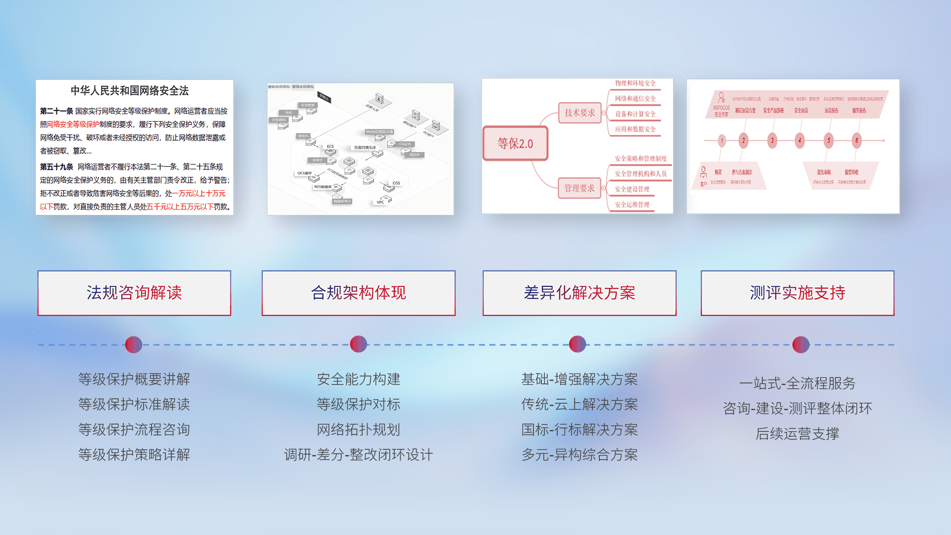 通过专业的法律咨询解读、、合规架构体现、、、差异化解决方案、、、测试实施支持等服务,,为客户量身打造等保合规体系。。